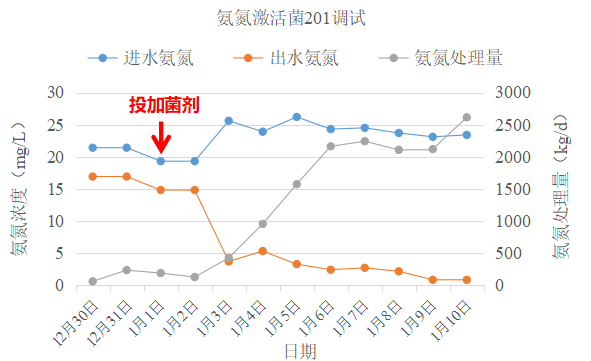 庫巴魯氨氮激活菌201投加3日后出水氨氮開始降低,系統硝化能力明顯好轉